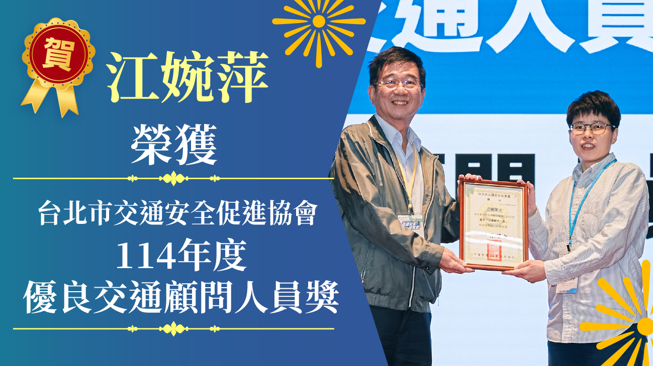 江婉萍、戴子純 君 榮獲台北市交通安全促進協會「114年度優良交通顧問人員獎」 - 2024.12.27